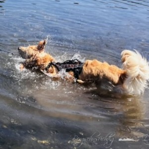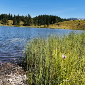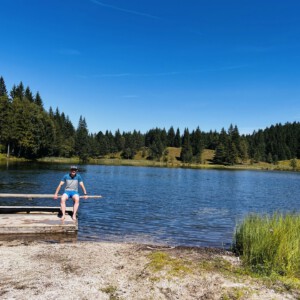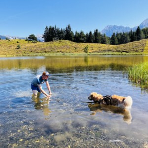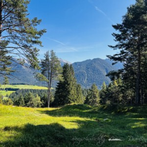 Zunächst besuchen wir ein kleines Marterl rechts auf einer Anhöhe. Danach heißt es Baden gehen. Auch wenn die Abkühlung im normalerweise nur etwa zwei Meter flachen Wildensee im Vergleich zu anderen Bergseen nicht extrem, aber dennoch erfrischend ist. Wir setzen uns auf den schmalen Steg, der in den See hinragt, und die genießen die Aussicht auf das Karwendel. Mio tropft derweil aus. Wir genießen die Ruhe. Einzig ein paar Enten geben Laut und Bäume rascheln im Wind. Echt Idylle.