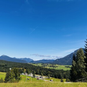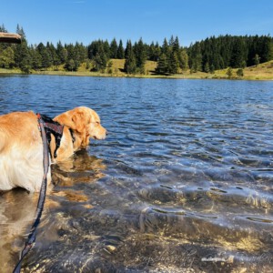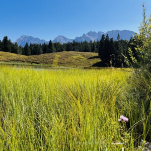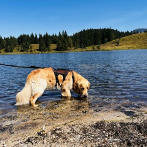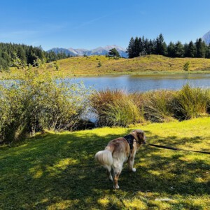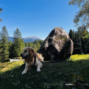 Das ändert sich als wir St. Anton erreichen. Wir wandern nun parallel zu einem Barfusspfad, stellenweise durch Wald und immer auf weichem Untergrund. Das Gelände wird jetzt flacher. Ein paar Buckelwiesen tauchen auf und laufen in Richtung Korbinianhütte, die wir allerdings rechts liegen lassen. Es ist nun nicht mehr weit bis zu unserem Startpunkt. Auf dem Weg dahin genießen wir noch einmal das atemberaubende Panorama und Mio die Quellen am Wegesrand. Die Sonne brennt ziemlich – es wird also Zeit, anzukommen