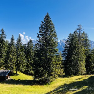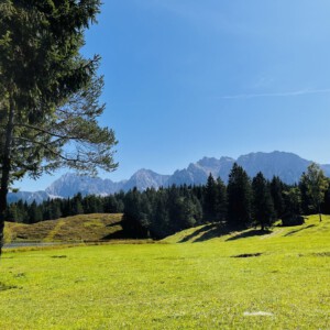 Doch die schönste Pause ist einmal vorbei. Schließlich will heute noch ein Gipfel erklommen werden. Wir folgen also unserem ursprünglichen Weg. Nach ein paar Minuten mündet dieser auf eine Straße, die allerdings wenig befahren ist, denn sie darf nur, bis auf wenige Ausnahmen, von Bundeswehr-Fahrzeugen genutzt werden. Das erklärt auch die Schießgeräusche, die immer wieder im Tal hörbar sind, und die zahlreichen Hinweis-Verbotsschilder, die auf einen ‚MIlitärischen Sicherheitsbereich‘ verweisen. Mittenwald ist eben Bundeswehrstandort.