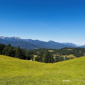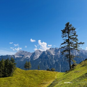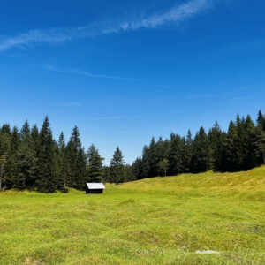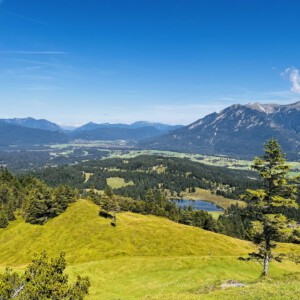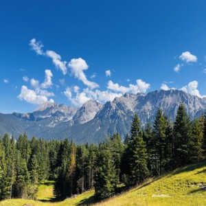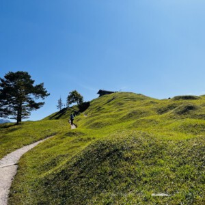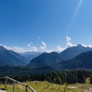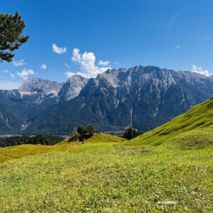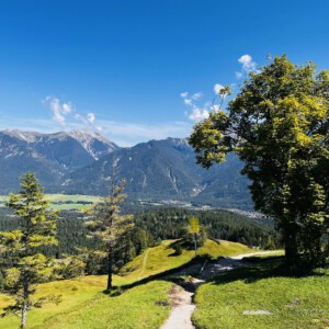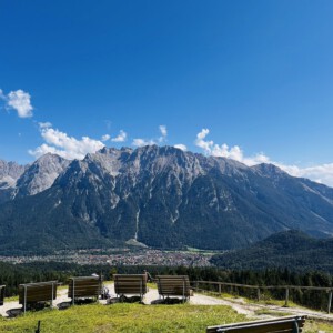 Die Bäume weichen zurück und wir sehen nicht nur die Karwendelspitze vis-a-vis, sondern zu unserer Rechten den Gipfel. Um diesen zu erreichen, müssen wir allerdings noch ein paar Höhenmeter erklimmen. Nach zwei, drei steilen Serpentinen, einer Menge Panorama erreichen wir den Gipfel auf 1.391 Metern, der mit einigen Ruhe(liege)bänken, ’normalen‘ Bänke und einer Holzhütte zahlreiche Möglichkeiten zum Pausieren bietet. Und genau das machen wir jetzt.