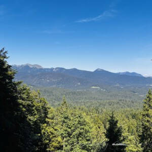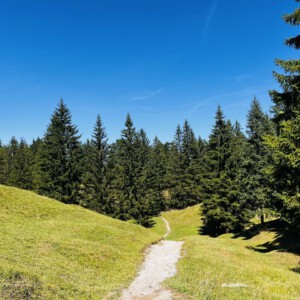 Danach schließt sich die Aussicht wieder und der Pfad steigt weiter an. Er mündet in ein entspanntes, kurviges Auf und Ab zwischen hohen Bäumen. Und so kommen wir unserem Ziel immer näher: dem Hohen Kranzberg. Uns begegnen trotz des exponierten Ziels auf dieser Route bisher relativ wenig Wanderer. Überraschend, aber schön für uns.