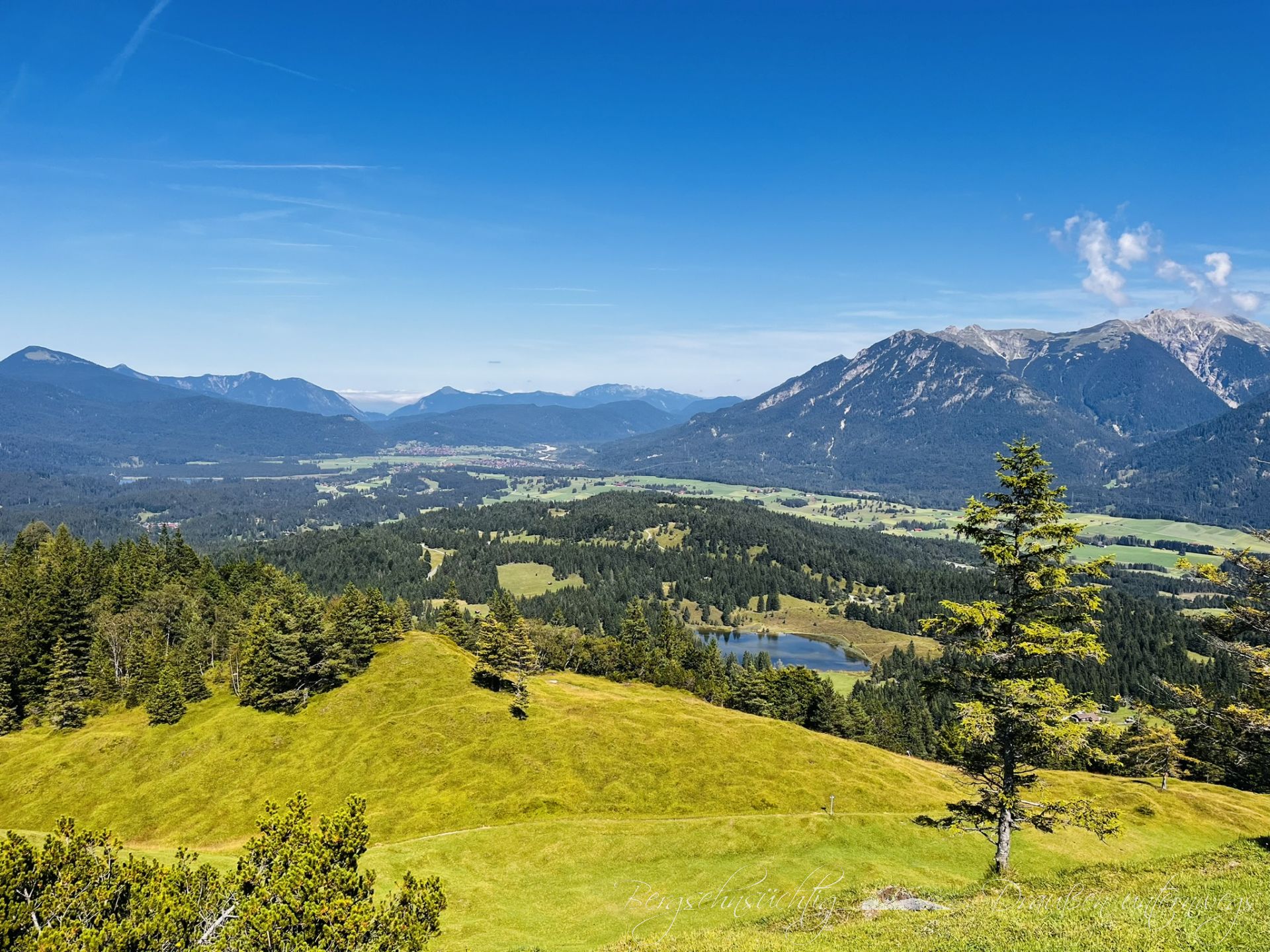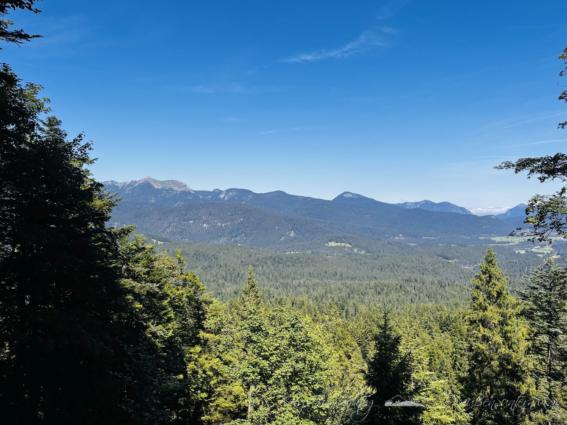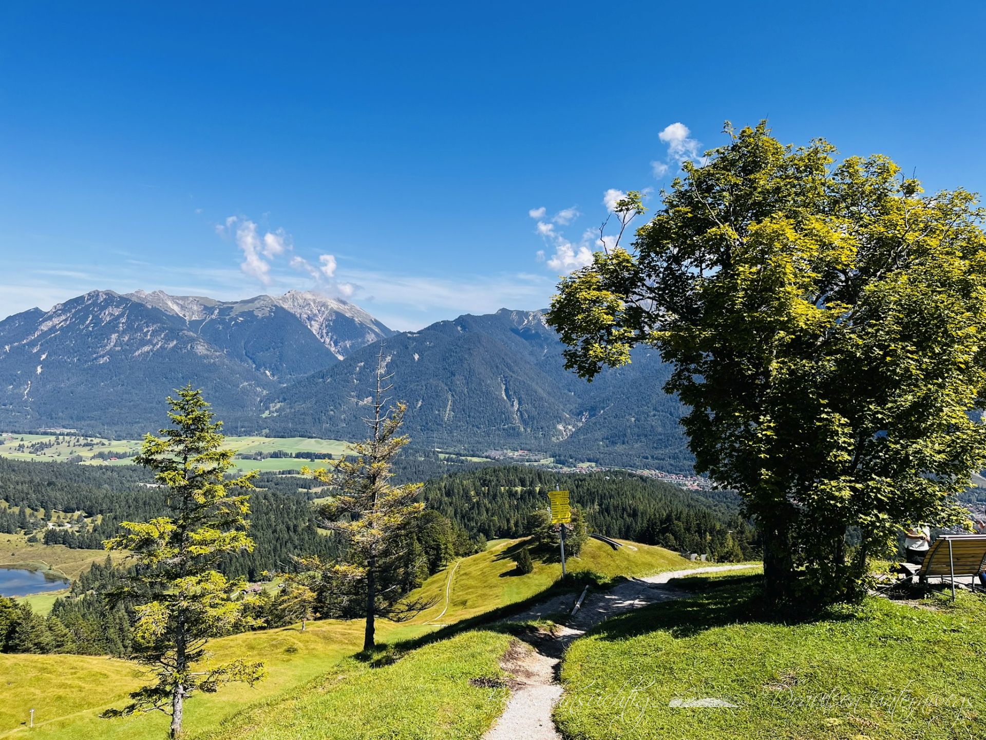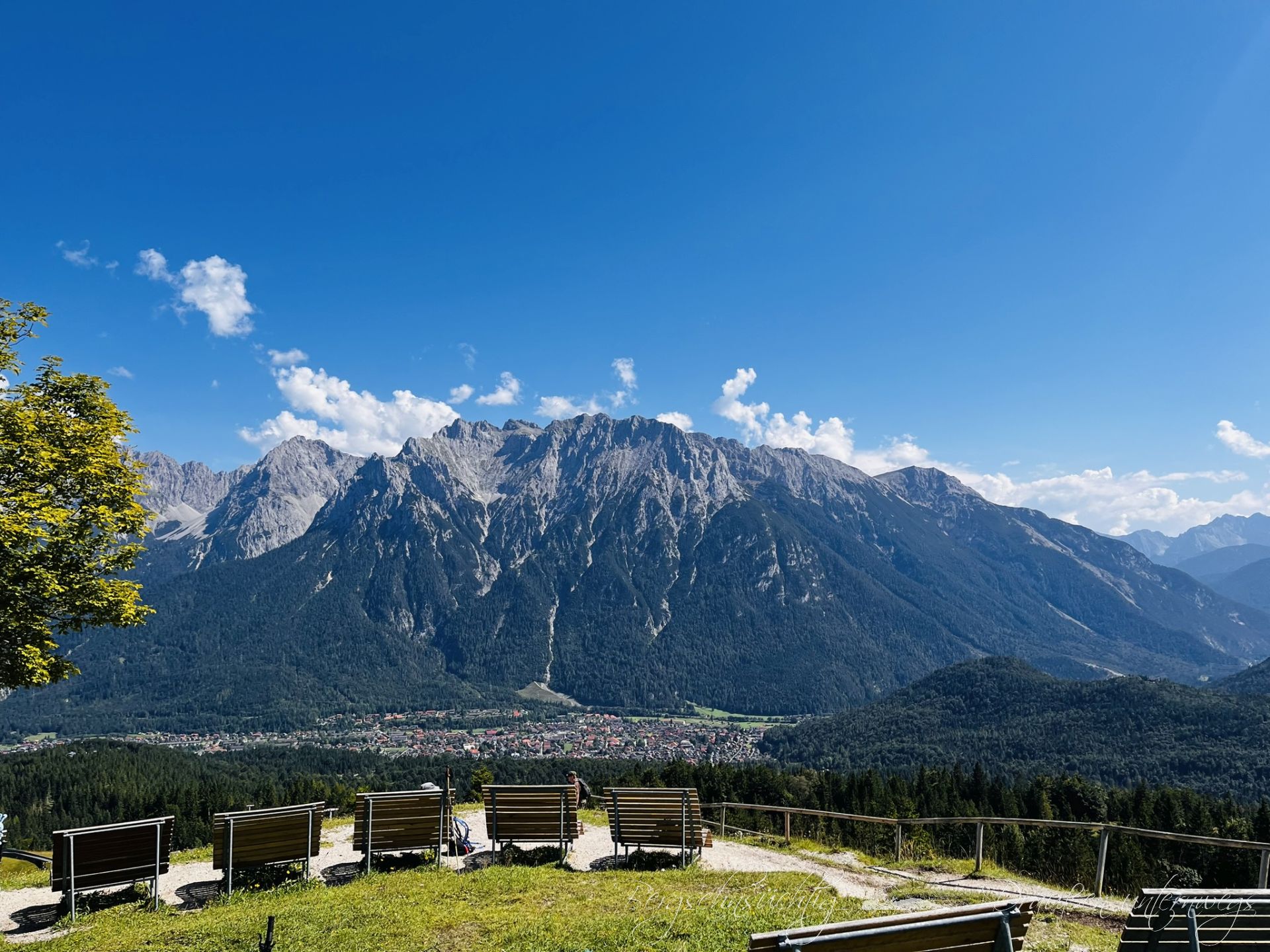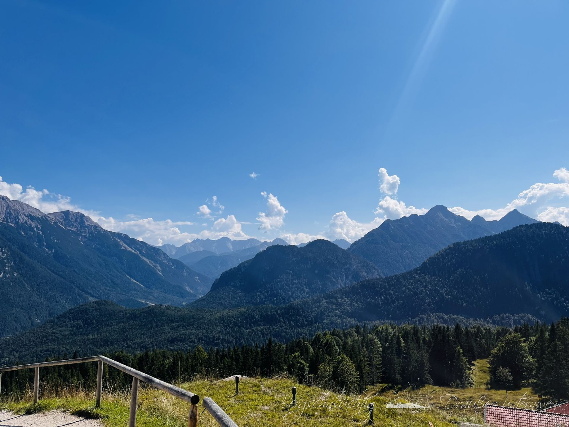 Die Bäume weichen zurück und wir sehen nicht nur die Karwendelspitze vis-a-vis, sondern zu unserer Rechten den Gipfel. Um diesen zu erreichen, müssen wir allerdings noch ein paar Höhenmeter erklimmen. Nach zwei, drei steilen Serpentinen, einer Menge Panorama erreichen wir den Gipfel auf 1.391 Metern, der mit einigen Ruhe(liege)bänken, ’normalen‘ Bänke und einer Holzhütte zahlreiche Möglichkeiten zum Pausieren bietet. Und genau das machen wir jetzt.