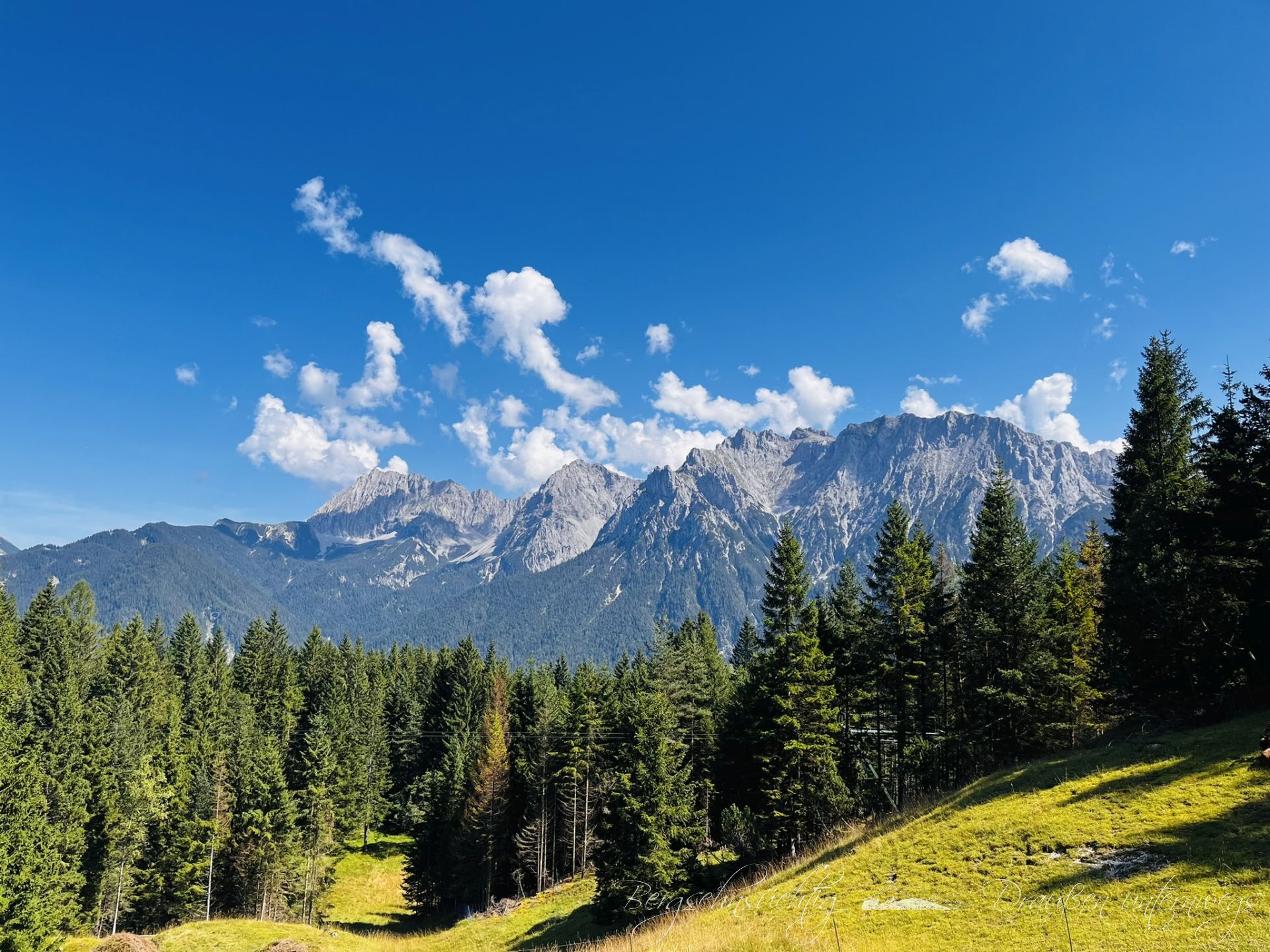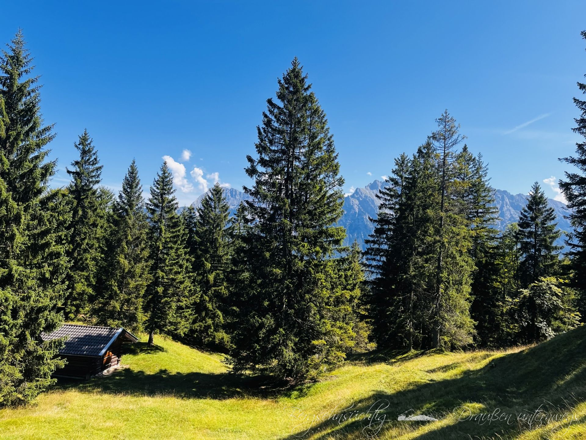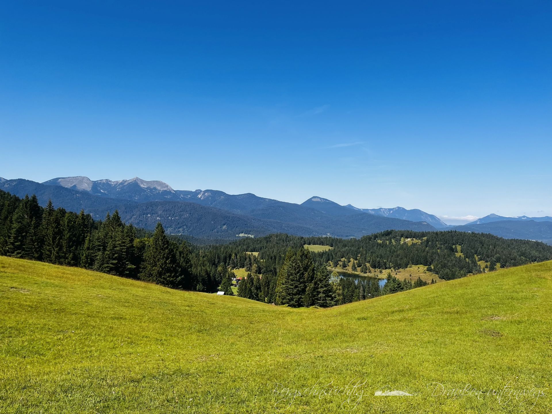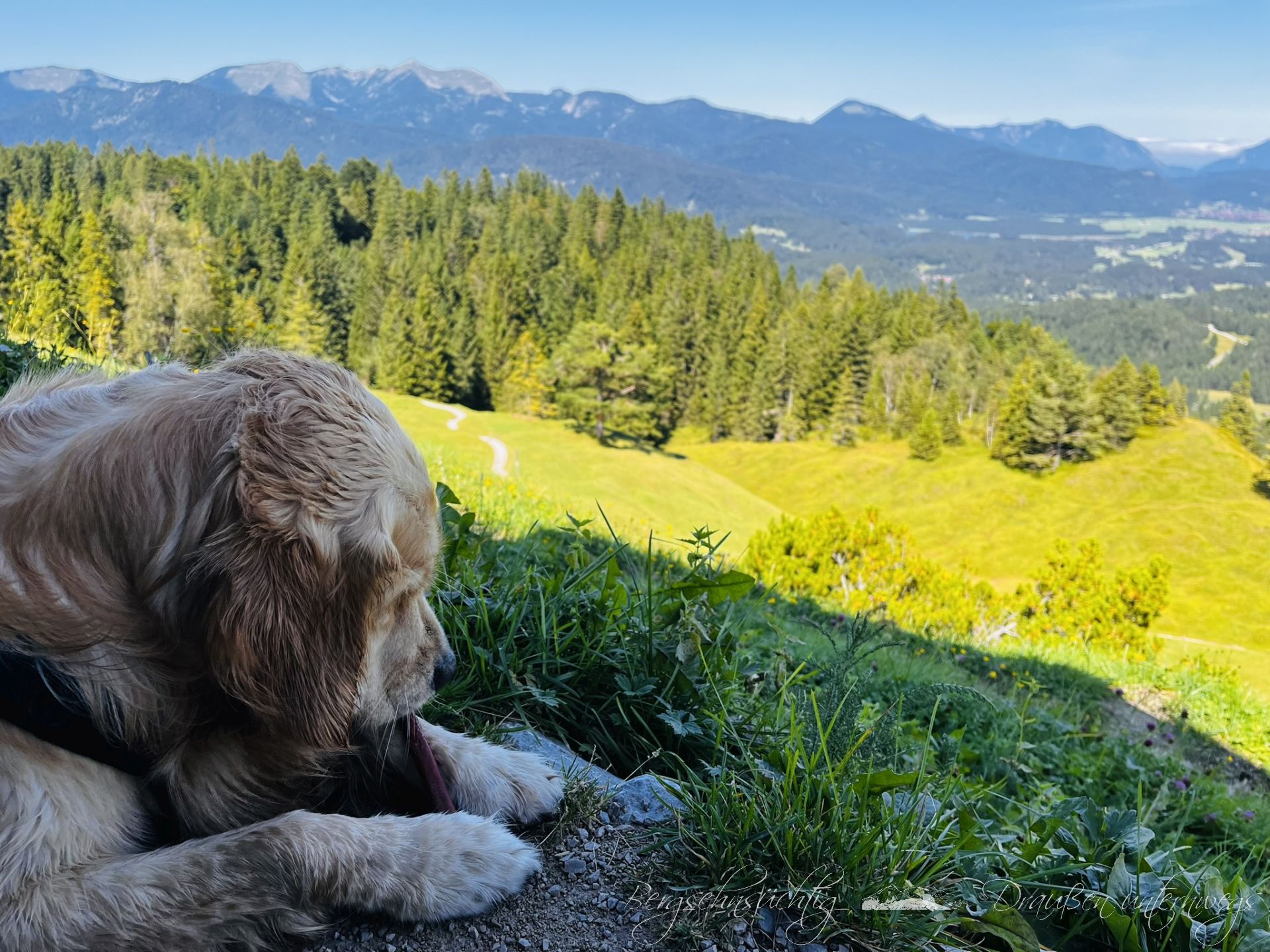 Die Bäume weichen zurück und wir sehen nicht nur die Karwendelspitze vis-a-vis, sondern zu unserer Rechten den Gipfel. Um diesen zu erreichen, müssen wir allerdings noch ein paar Höhenmeter erklimmen. Nach zwei, drei steilen Serpentinen, einer Menge Panorama erreichen wir den Gipfel auf 1.391 Metern, der mit einigen Ruhe(liege)bänken, ’normalen‘ Bänke und einer Holzhütte zahlreiche Möglichkeiten zum Pausieren bietet. Und genau das machen wir jetzt.