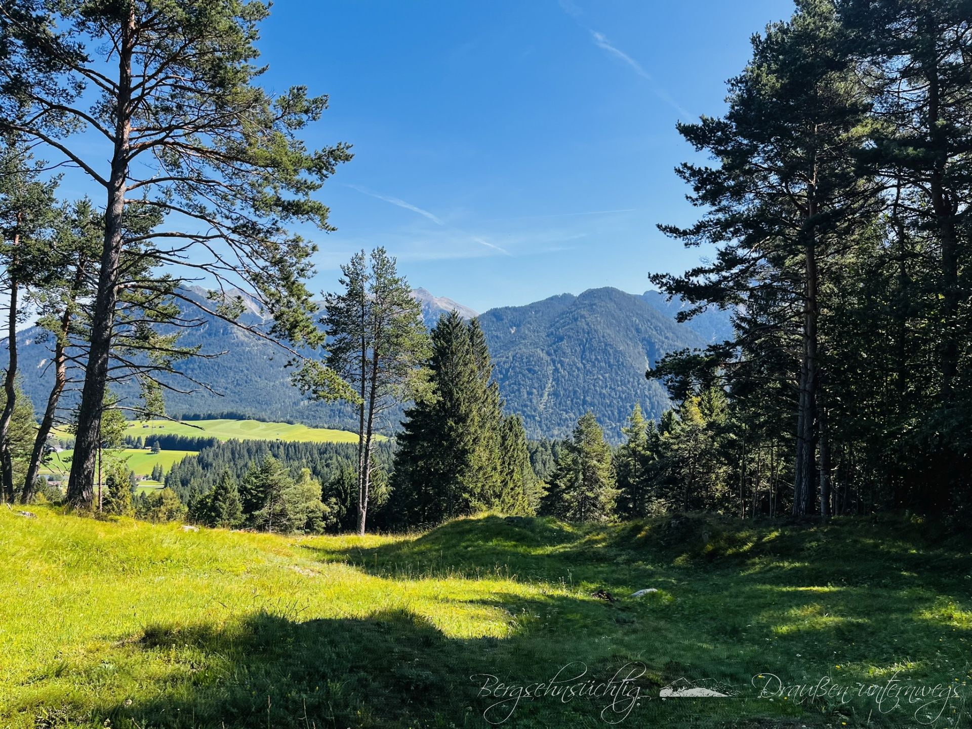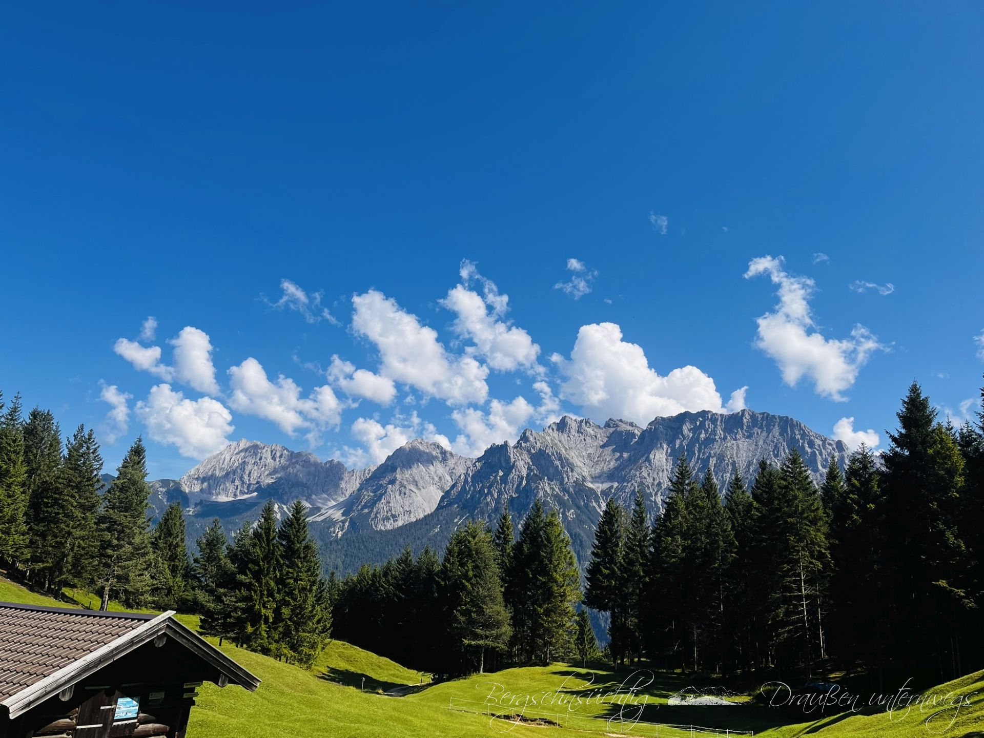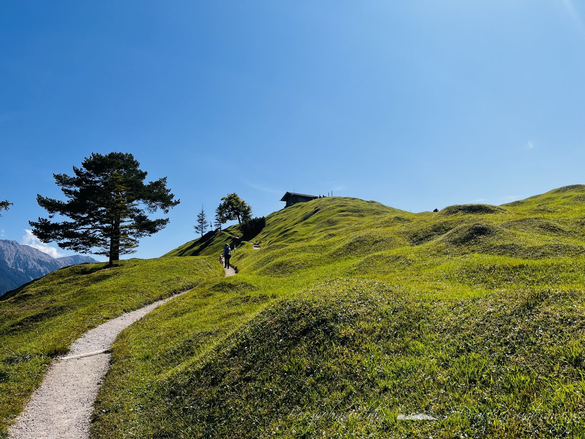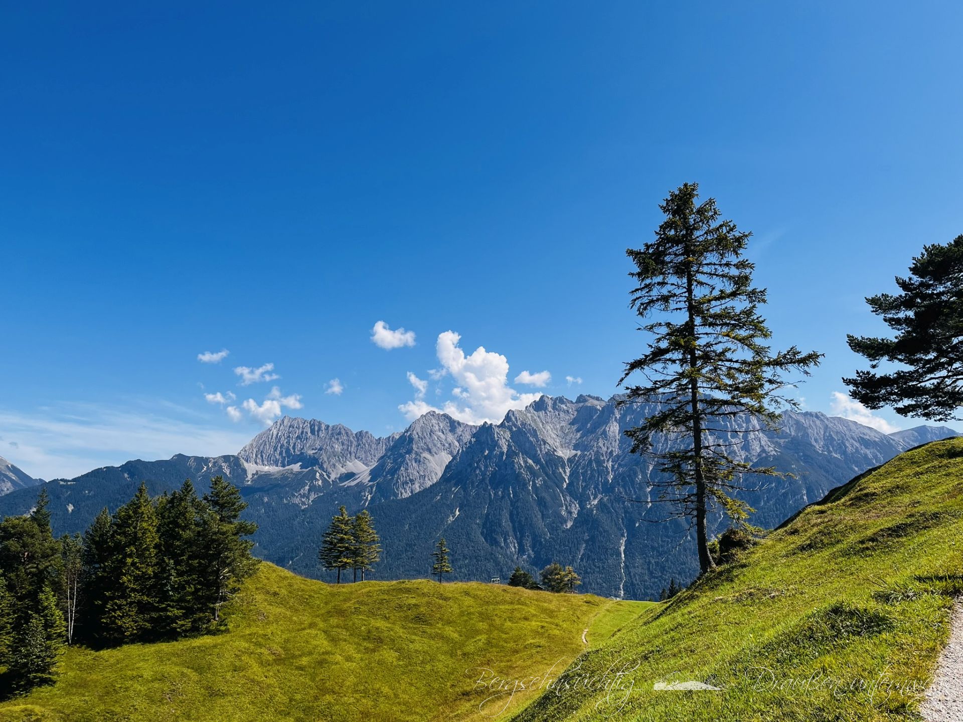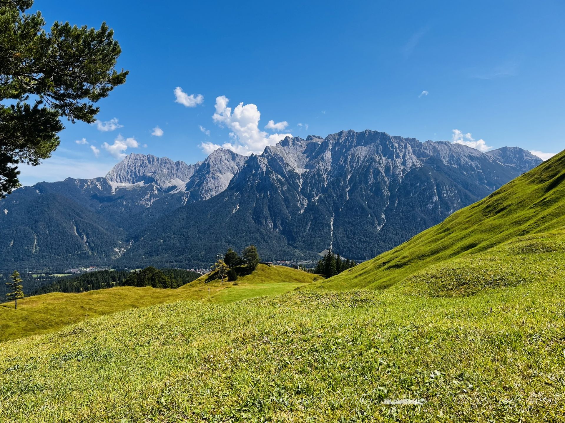 Die Bäume weichen zurück und wir sehen nicht nur die Karwendelspitze vis-a-vis, sondern zu unserer Rechten den Gipfel. Um diesen zu erreichen, müssen wir allerdings noch ein paar Höhenmeter erklimmen. Nach zwei, drei steilen Serpentinen, einer Menge Panorama erreichen wir den Gipfel auf 1.391 Metern, der mit einigen Ruhe(liege)bänken, ’normalen‘ Bänke und einer Holzhütte zahlreiche Möglichkeiten zum Pausieren bietet. Und genau das machen wir jetzt.