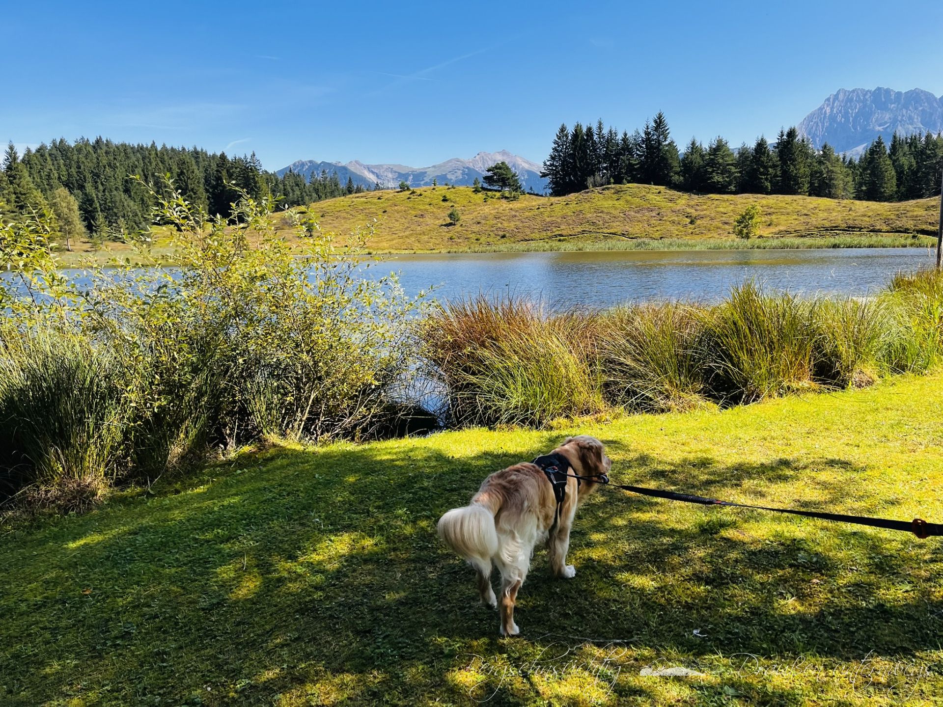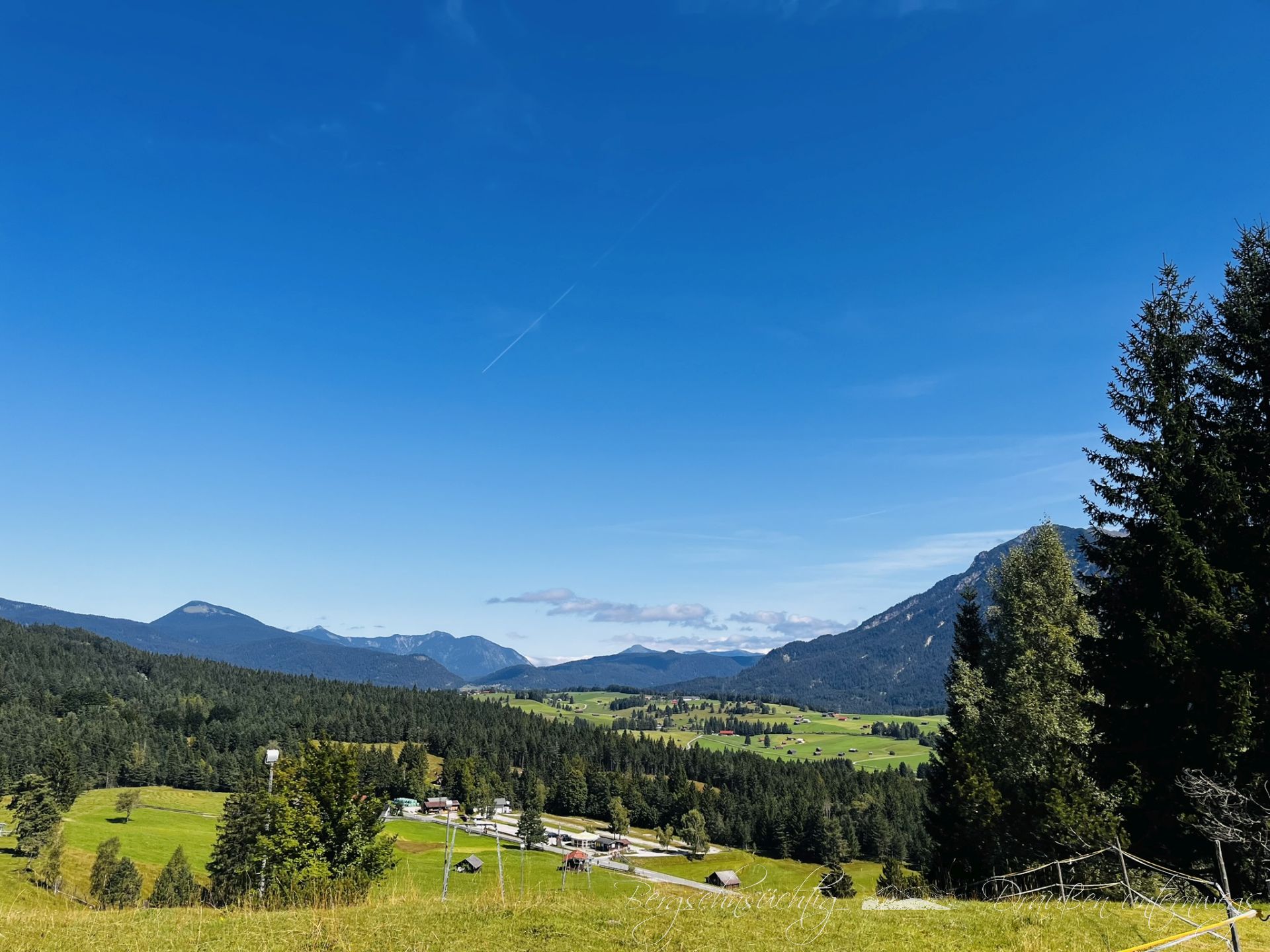 Das ändert sich als wir St. Anton erreichen. Wir wandern nun parallel zu einem Barfusspfad, stellenweise durch Wald und immer auf weichem Untergrund. Das Gelände wird jetzt flacher. Ein paar Buckelwiesen tauchen auf und laufen in Richtung Korbinianhütte, die wir allerdings rechts liegen lassen. Es ist nun nicht mehr weit bis zu unserem Startpunkt. Auf dem Weg dahin genießen wir noch einmal das atemberaubende Panorama und Mio die Quellen am Wegesrand. Die Sonne brennt ziemlich – es wird also Zeit, anzukommen