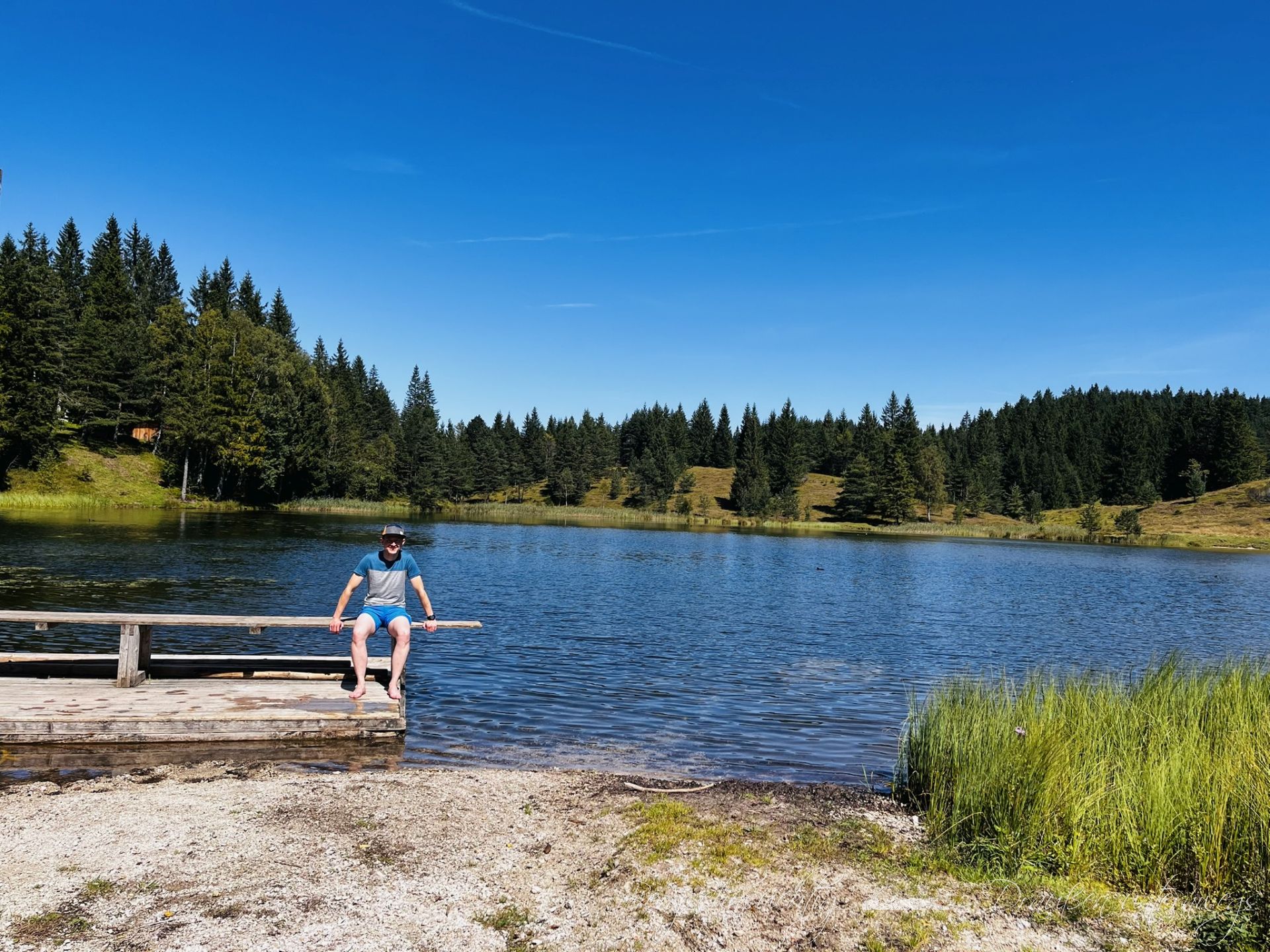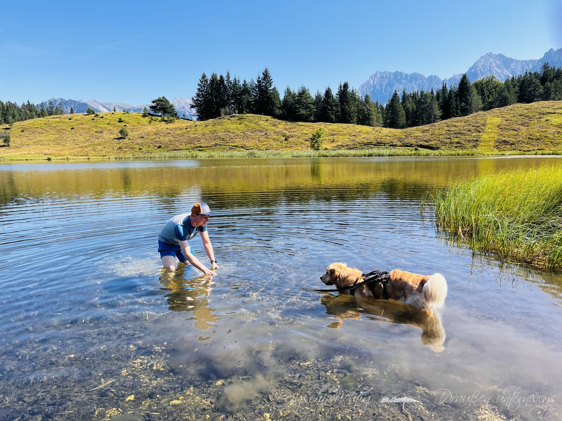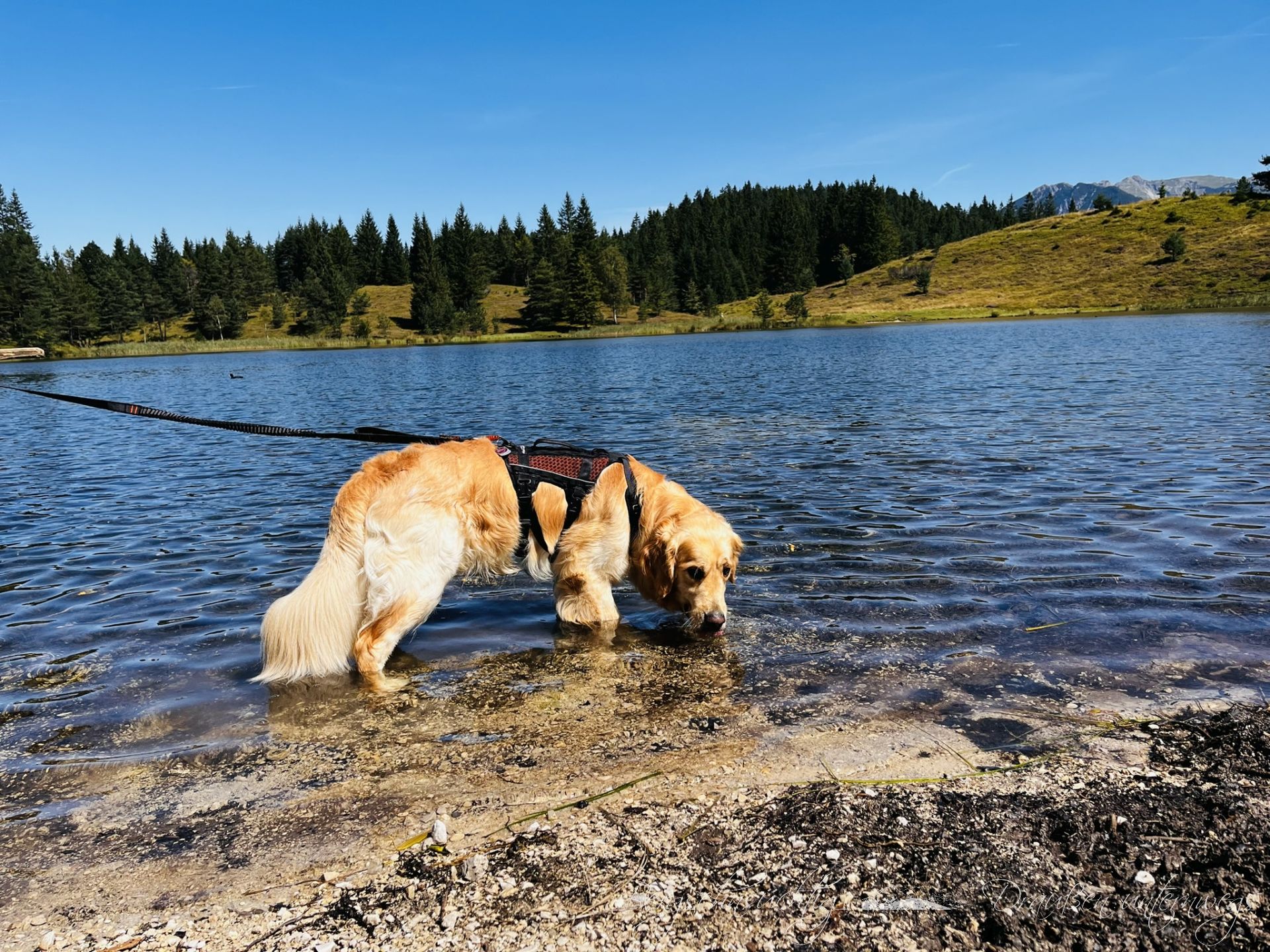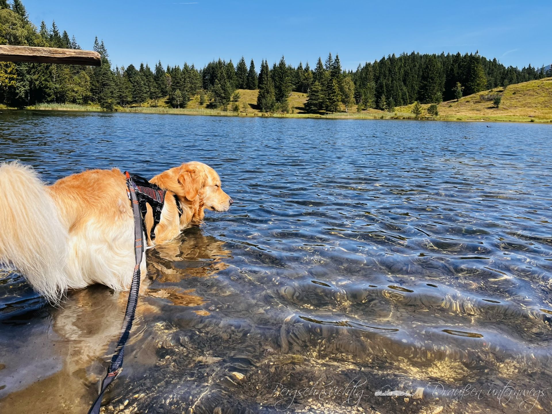 Zunächst besuchen wir ein kleines Marterl rechts auf einer Anhöhe. Danach heißt es Baden gehen. Auch wenn die Abkühlung im normalerweise nur etwa zwei Meter flachen Wildensee im Vergleich zu anderen Bergseen nicht extrem, aber dennoch erfrischend ist. Wir setzen uns auf den schmalen Steg, der in den See hinragt, und die genießen die Aussicht auf das Karwendel. Mio tropft derweil aus. Wir genießen die Ruhe. Einzig ein paar Enten geben Laut und Bäume rascheln im Wind. Echt Idylle.
