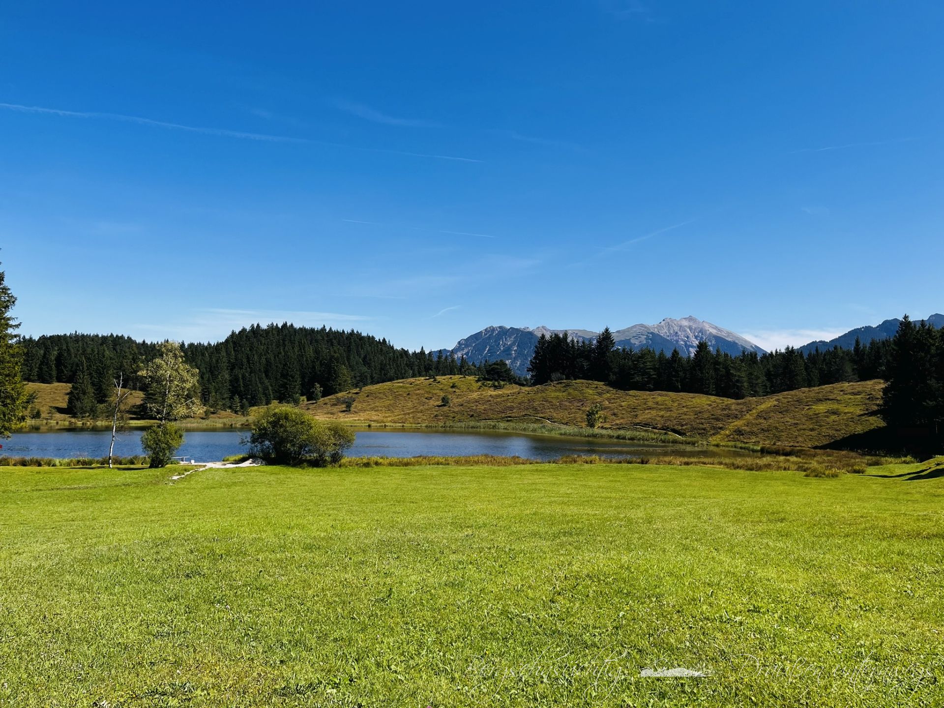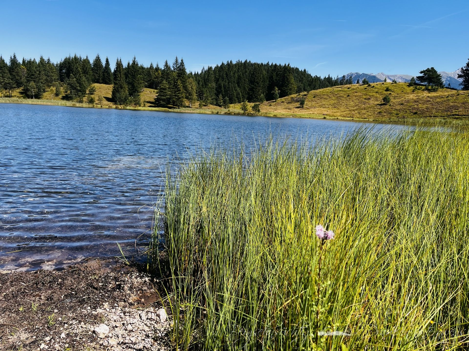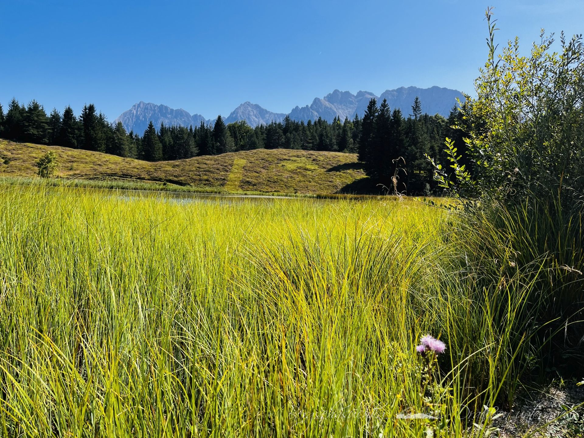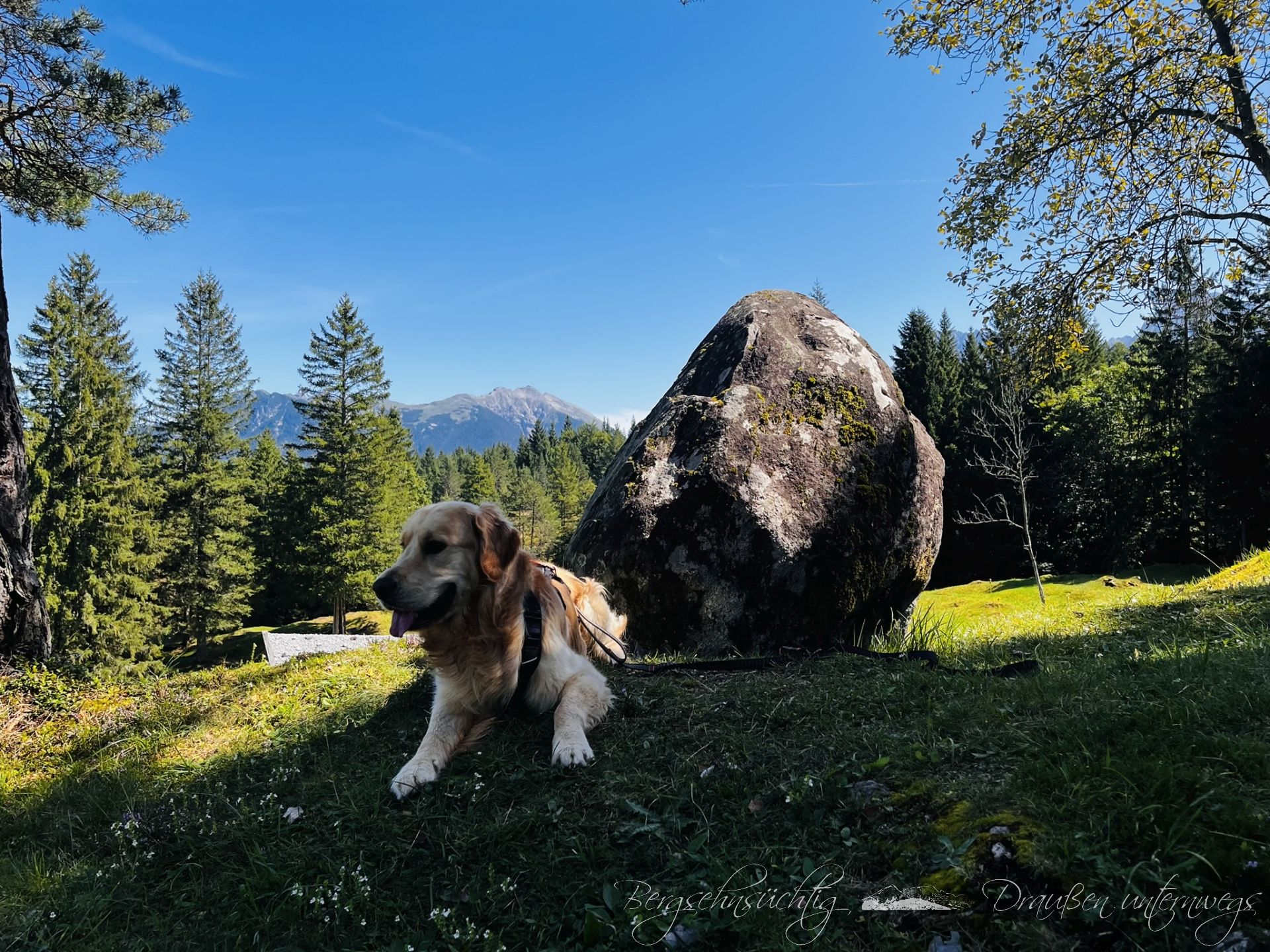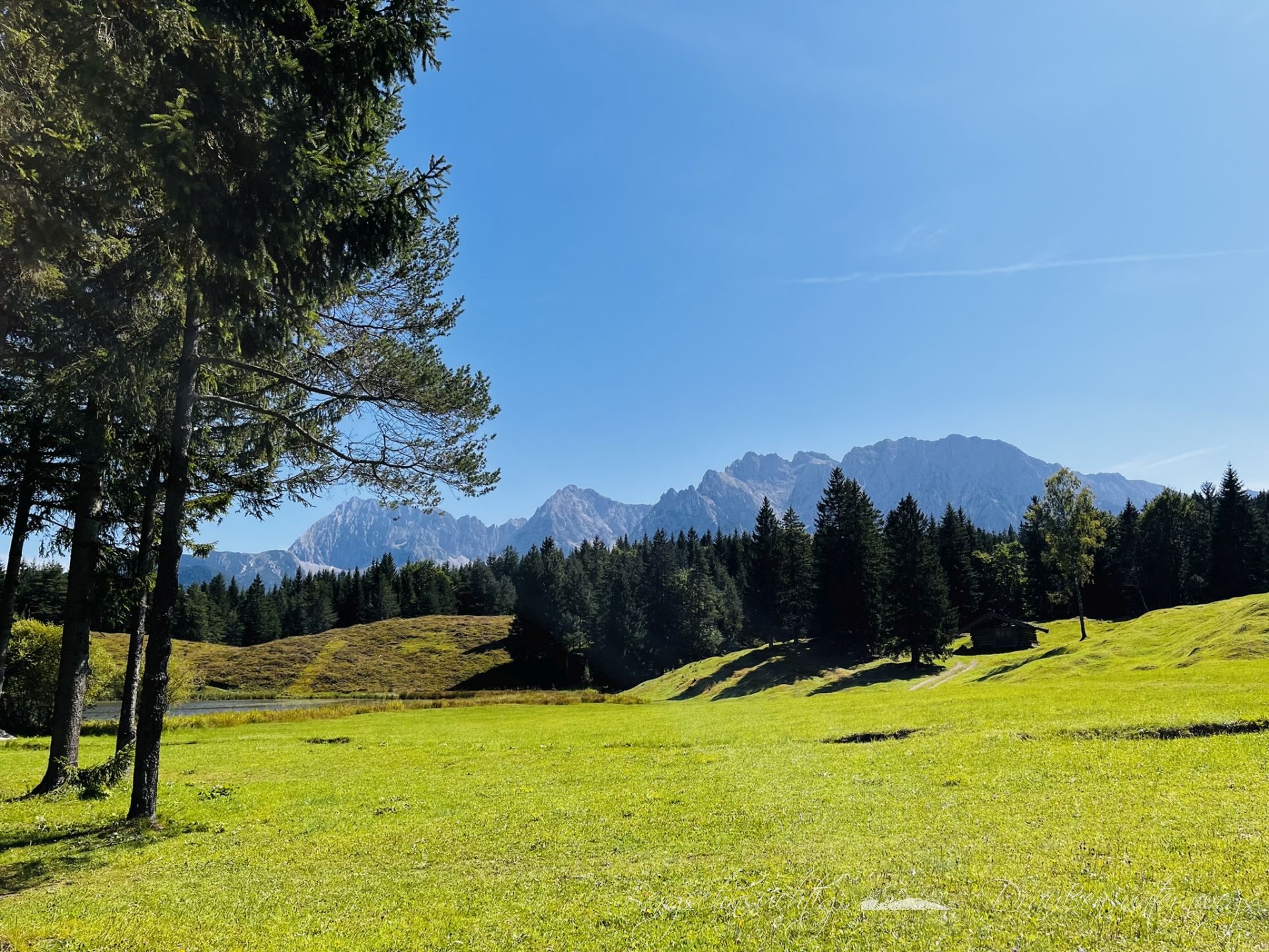 Zunächst besuchen wir ein kleines Marterl rechts auf einer Anhöhe. Danach heißt es Baden gehen. Auch wenn die Abkühlung im normalerweise nur etwa zwei Meter flachen Wildensee im Vergleich zu anderen Bergseen nicht extrem, aber dennoch erfrischend ist. Wir setzen uns auf den schmalen Steg, der in den See hinragt, und die genießen die Aussicht auf das Karwendel. Mio tropft derweil aus. Wir genießen die Ruhe. Einzig ein paar Enten geben Laut und Bäume rascheln im Wind. Echt Idylle.