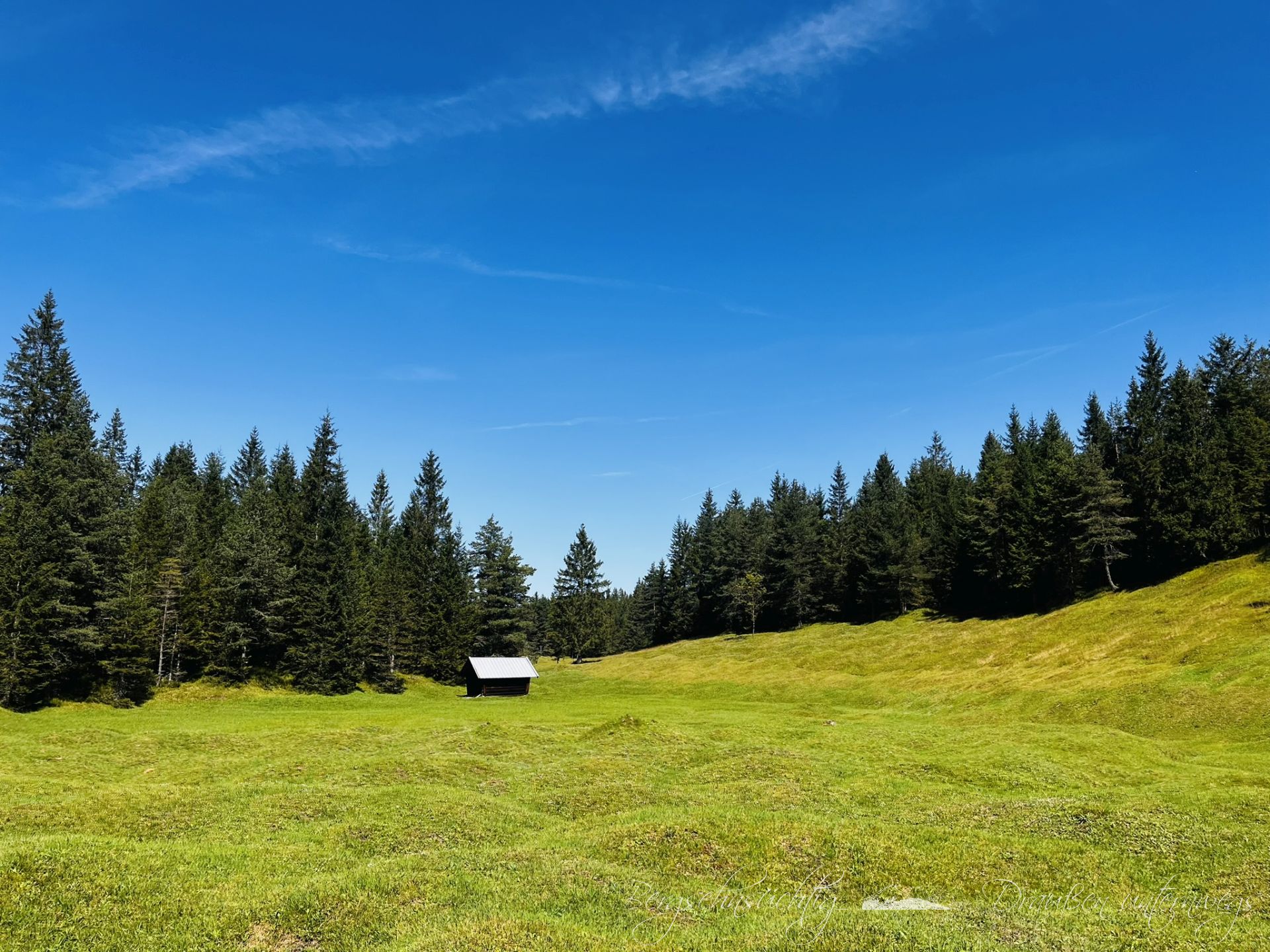 Doch die schönste Pause ist einmal vorbei. Schließlich will heute noch ein Gipfel erklommen werden. Wir folgen also unserem ursprünglichen Weg. Nach ein paar Minuten mündet dieser auf eine Straße, die allerdings wenig befahren ist, denn sie darf nur, bis auf wenige Ausnahmen, von Bundeswehr-Fahrzeugen genutzt werden. Das erklärt auch die Schießgeräusche, die immer wieder im Tal hörbar sind, und die zahlreichen Hinweis-Verbotsschilder, die auf einen ‚MIlitärischen Sicherheitsbereich‘ verweisen. Mittenwald ist eben Bundeswehrstandort.