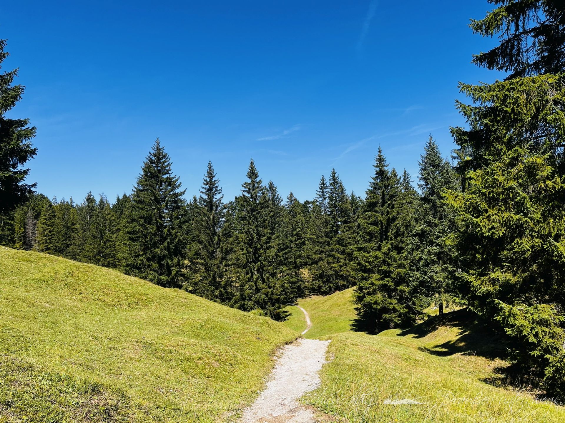 Danach schließt sich die Aussicht wieder und der Pfad steigt weiter an. Er mündet in ein entspanntes, kurviges Auf und Ab zwischen hohen Bäumen. Und so kommen wir unserem Ziel immer näher: dem Hohen Kranzberg. Uns begegnen trotz des exponierten Ziels auf dieser Route bisher relativ wenig Wanderer. Überraschend, aber schön für uns.